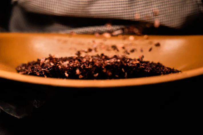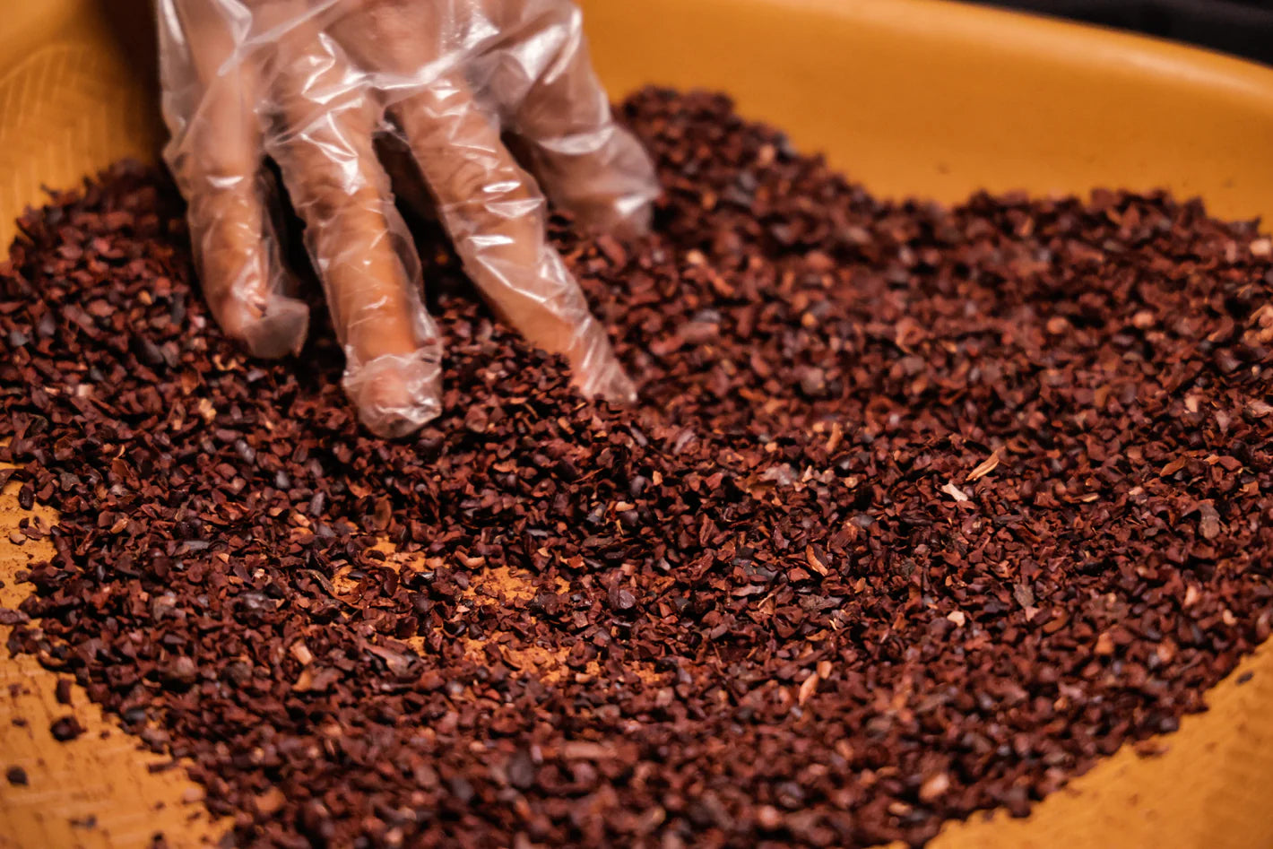 The roasted beans are cracked open and the outer husk is removed to obtain the cacao nibs, which are used in making chocolate.