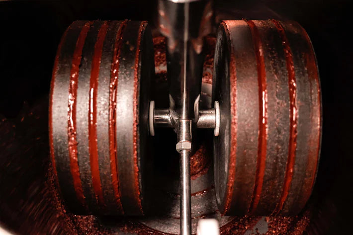 The cacao nibs are ground in the melanger to release natural cacao butter and blended with other ingredients to give cacao paste. This is ground to a fine silky smooth consistency.